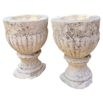 Pair Hand Carved Stone Pillar Finials Decorative Urns Vase Rustic Antiques LA CA
