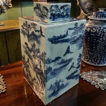 Square Chinese Celadon Indigo Porcelain Covered Jar Modern Center Piece Vase CA
