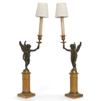 Early 19th Century Of Empire Parcel Gilt And Patinated Bronze Figural Candlesticks Turned Into Lamps