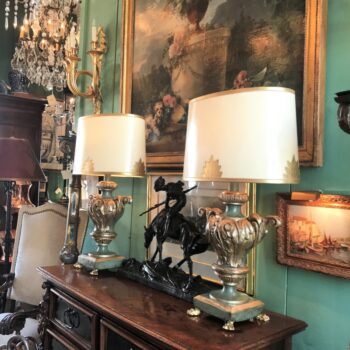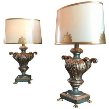 Pair Table Lamps Antique Venetian Carved Wood Urns gilt Green / Shades & finial