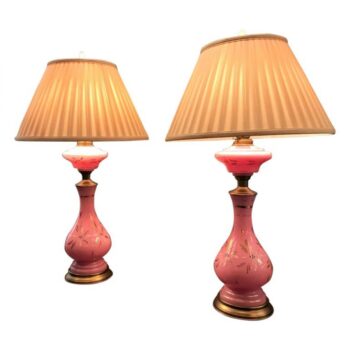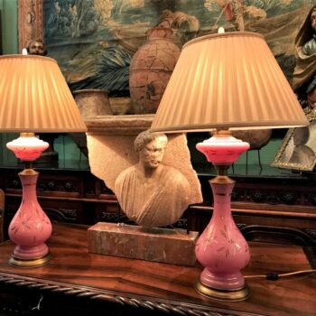 19th C. Pair Pink side Table Lamps Opaline Glass Vase Nightstand Lights antiques