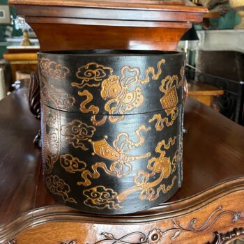 Carved vide poche. A later copper center liner hand hammered to use as a Dresser