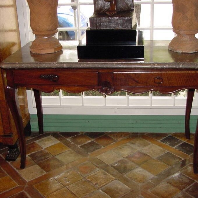 18th Century Regence Game / Hunting Table In Walnut  With Original Marble Top  SOLD Height: 34 1/2″  Width: 57 1/2″  Depth: 26 3/4″
