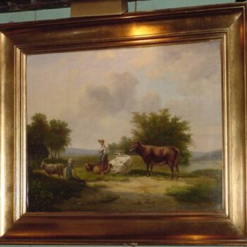 Height 27 1/2″  Width 35 1/2″ and Depth 2″  19th C. Orientalist Painting Pastel Arab and Camel, desert landscape fauna Flora . Beautiful and fine 19th century orientalist Pastel painting of an Arab Man with his camel traveling in the desert looking into the pink glow of the sun. In gilt frame. which depicts a […]