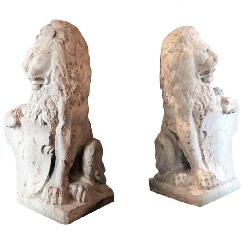 terracotta Figures of regal lions, holding an impalement escutcheon A heraldic