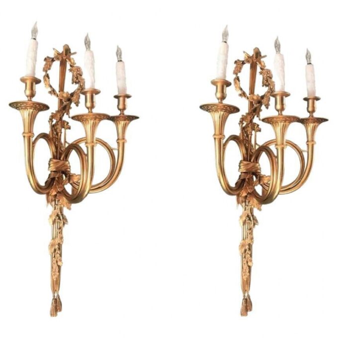 trumpet wall sconces, bronze doré. Wreath and bow and tassels hanging at the