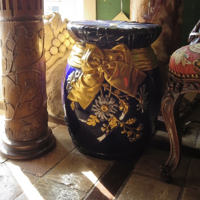 Pair Of Late 19th Century “Minton” Garden Ceramic Seats  Gilded and Glazed Cobalt Blue  Height: 18″  Diameter: 13″