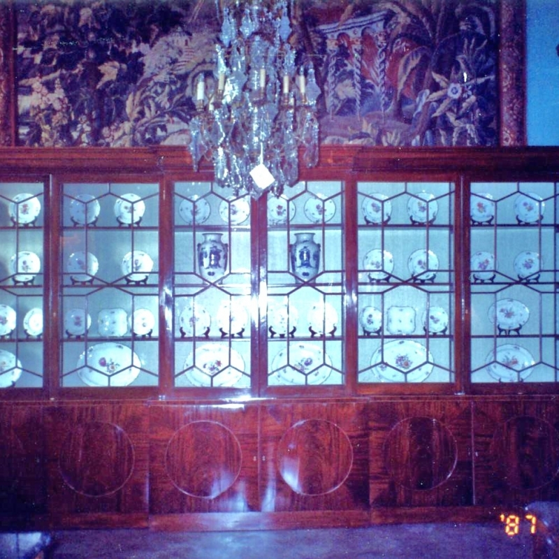 Rare & Exceptional 18th Century George III Mahogany Breakfront From A Sussex England Estate  Original Glass  Height: 8′ 10″  Width: 15′ 2″  Depth: 19″
